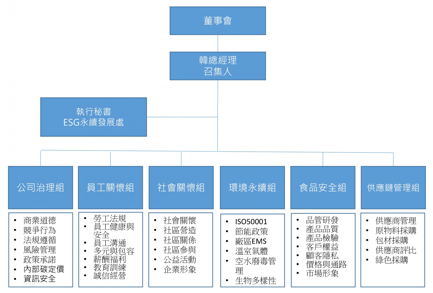 本委員會推行各項計畫,於本委員會下設立公司治理組、員工關懷組、社會關懷組、環境永續組、食品安全組及供應鏈管理組,並向本委員會呈報永續發展之執行情形。
